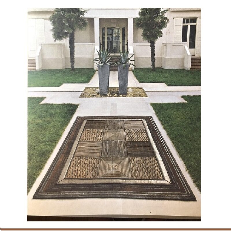 Tappeto con geometrie di quadri in pelle dallo stile esclusivo, bordati in suede e pellame pieno fiore antichizzato, arricchiti con dettagli decorativi cuciti interamente a mano.